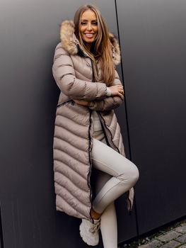 Καφέ γυναικείο μακρύ καπιτονέ μπουφάν τύπου παλτό χειμερινό με φυσική γούνα Bolf M688