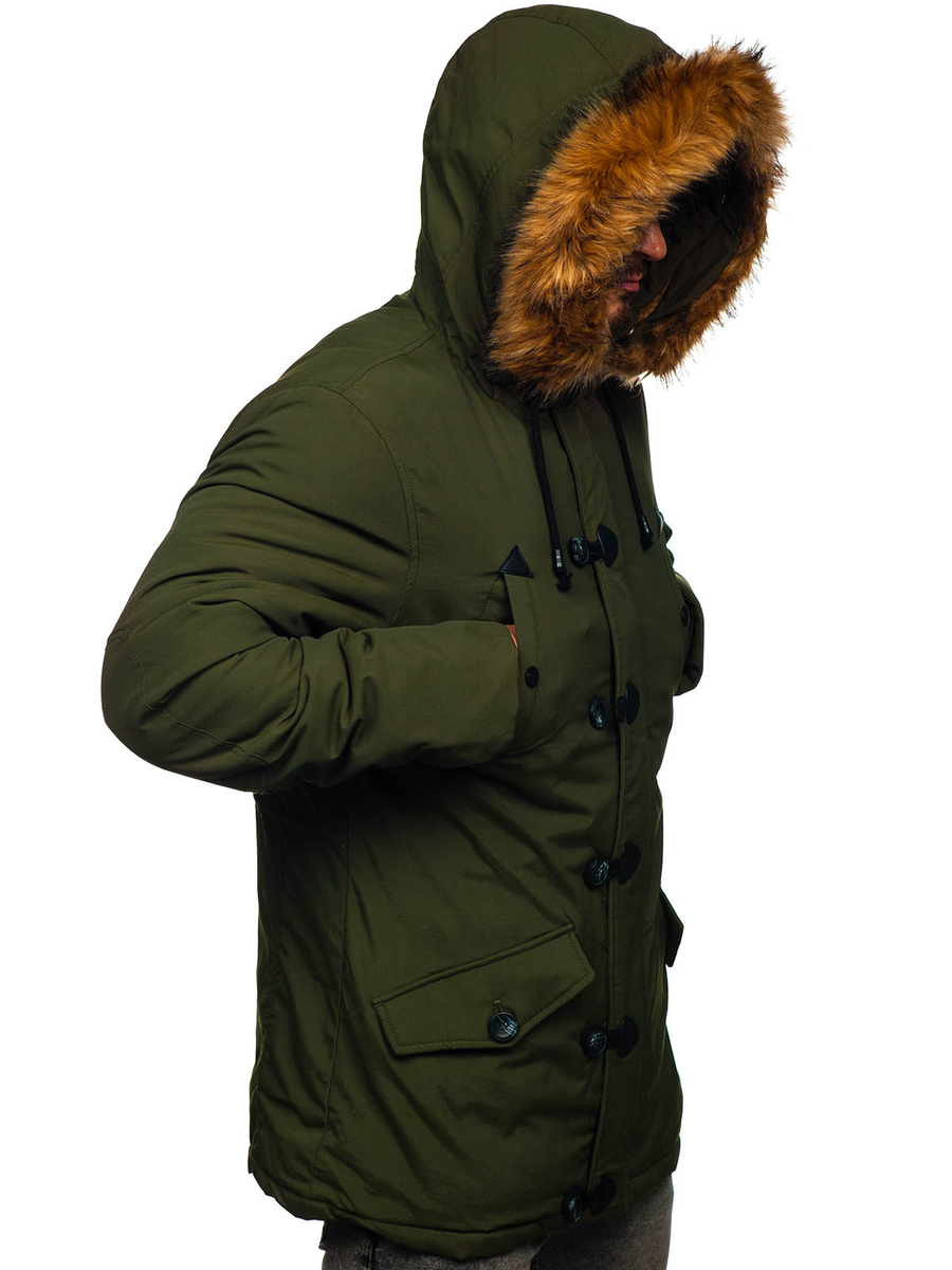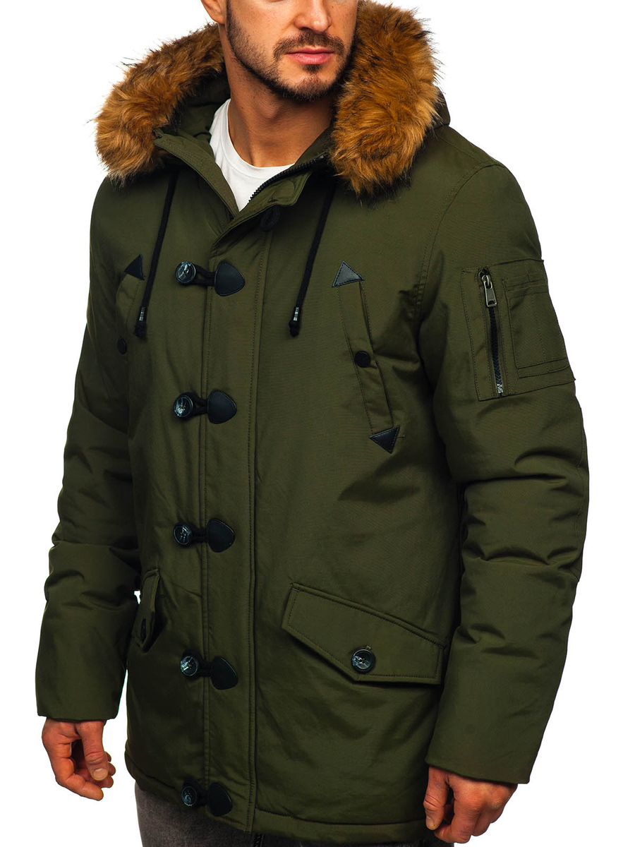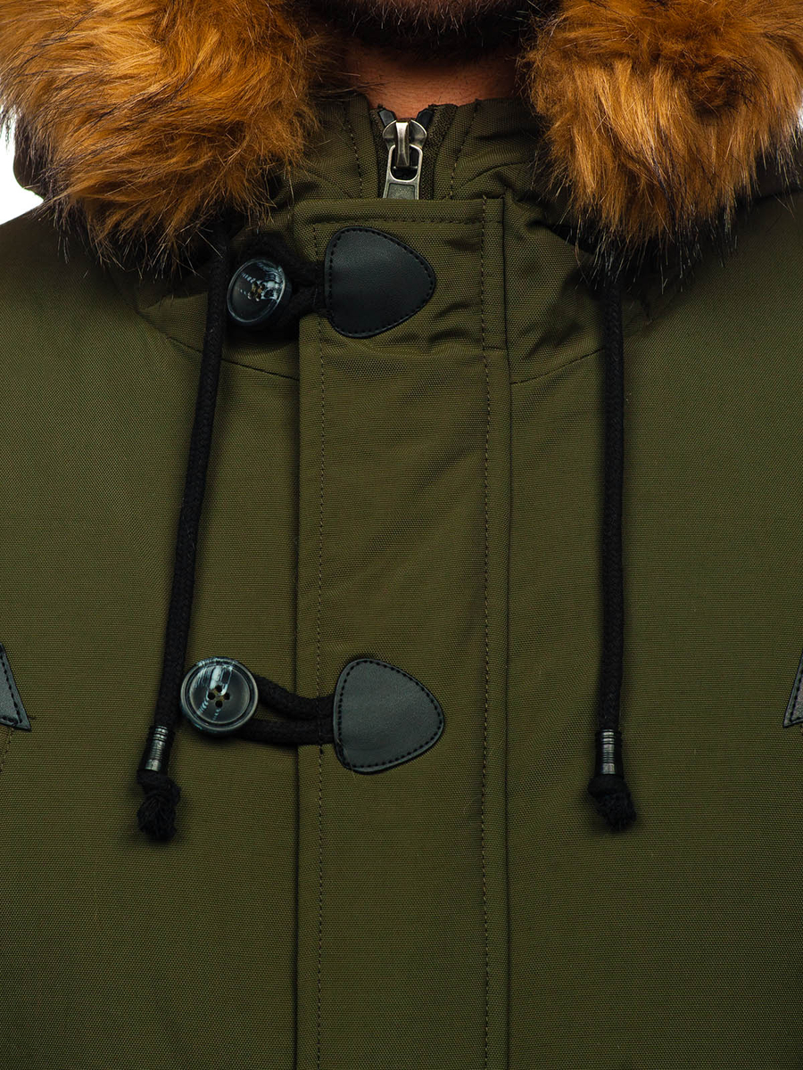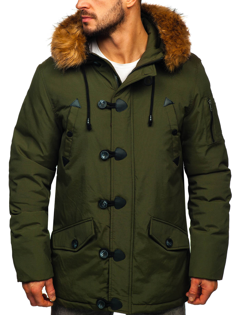 Η ανδρική χειμερινή πράσινη παρκά Bolf 1888 είναι εξαιρετικά καλοραμμένη και διαθέτει μακρύ σχεδιασμό. Αυτό το μοντέλο κλείνει με φερμουάρ και μεγάλα, στυλάτα κουμπιά. Η παρκά έχει ενσωματωμένη, κλειστή κουκούλα χωρίς ρύθμιση, αλλά με αποσπώμενη γούνα. Ο γιακάς της μπουφάν είναι συνδεδεμένος με την κουκούλα. Διαθέτει τέσσερις ευρύχωρες, πρακτικές τσέπες που κλείνουν με σούστες: δύο με πιέτα στο κάτω μέρος και δύο στο στήθος. Έχει επίσης μία εσωτερική τσέπη με κουμπί, για να αποθηκεύετε τα πιο πολύτιμα αντικείμενα. Τα μανίκια τελειώνουν εσωτερικά με ελαστικές μανσέτες, προσφέροντας καλύτερη προστασία από το κρύο.