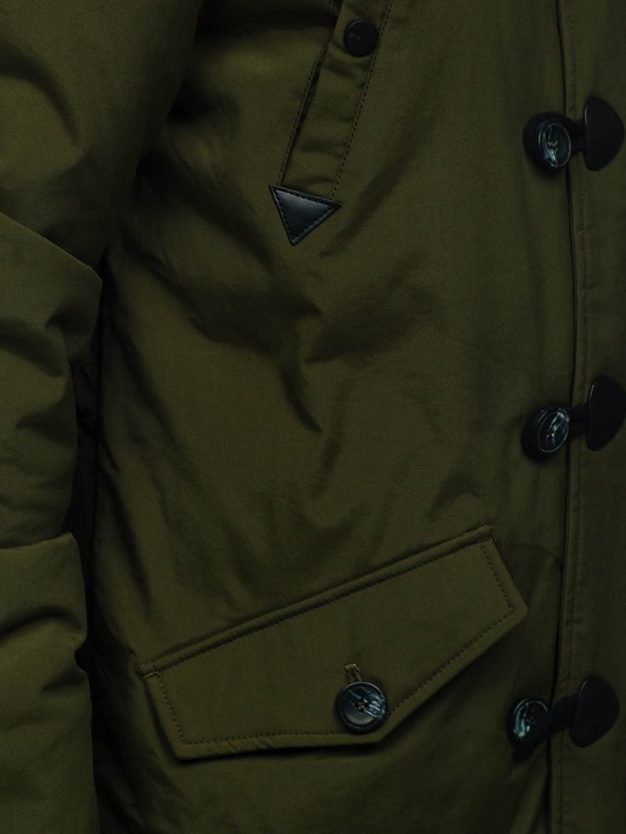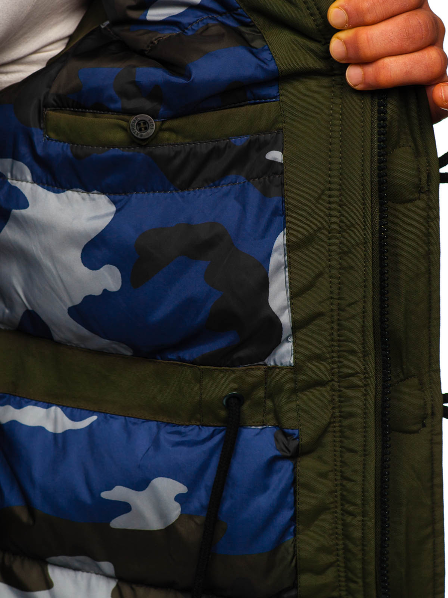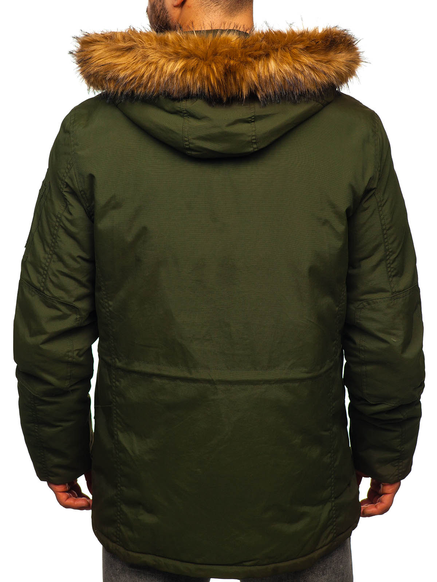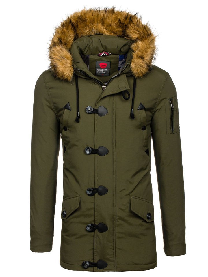 Η ανδρική χειμερινή πράσινη παρκά Bolf 1888 είναι εξαιρετικά καλοραμμένη και διαθέτει μακρύ σχεδιασμό. Αυτό το μοντέλο κλείνει με φερμουάρ και μεγάλα, στυλάτα κουμπιά. Η παρκά έχει ενσωματωμένη, κλειστή κουκούλα χωρίς ρύθμιση, αλλά με αποσπώμενη γούνα. Ο γιακάς της μπουφάν είναι συνδεδεμένος με την κουκούλα. Διαθέτει τέσσερις ευρύχωρες, πρακτικές τσέπες που κλείνουν με σούστες: δύο με πιέτα στο κάτω μέρος και δύο στο στήθος. Έχει επίσης μία εσωτερική τσέπη με κουμπί, για να αποθηκεύετε τα πιο πολύτιμα αντικείμενα. Τα μανίκια τελειώνουν εσωτερικά με ελαστικές μανσέτες, προσφέροντας καλύτερη προστασία από το κρύο.