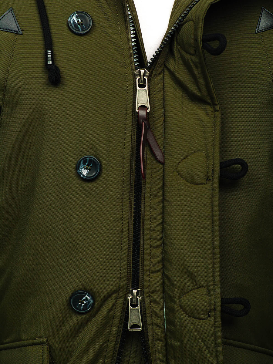 - Η κουκούλα είναι ενσωματωμένη, κλειστή, χωρίς ρύθμιση, και κλείνει με φερμουάρ και κουμπιά