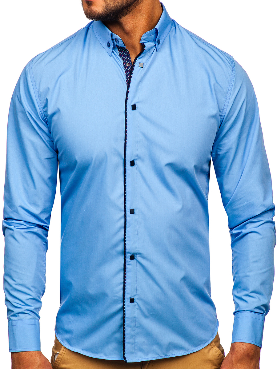 Błękitne koszule z długim rękawem i kontrastowymi detalami. Modne, wygodne, doskonałej jakości. Błękitna koszula męska slim fit Bolf rewelacyjnie wygląda z jeansami i spodniami chino. Ma fajny kołnierzyk z guziczkami. Znakomicie sprawdzi się w codziennych, stylowych outfitach.