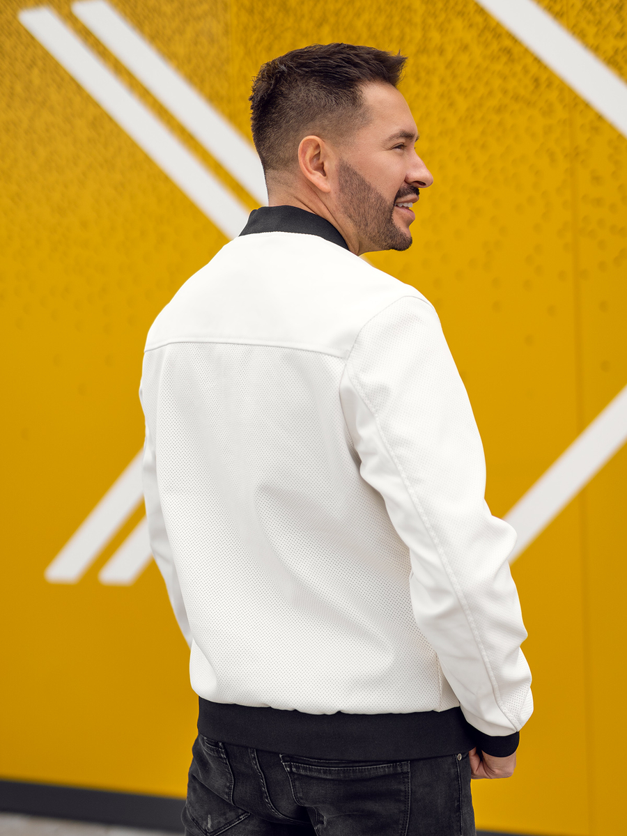 Το λευκό ανδρικό δερμάτινο μπουφάν Bolf 7110 έχει κλασικό, ίσιο κόψιμο. Κλείνεται με φερμουάρ και έχει όρθιο γιακά που τελειώνει με λάστιχο.