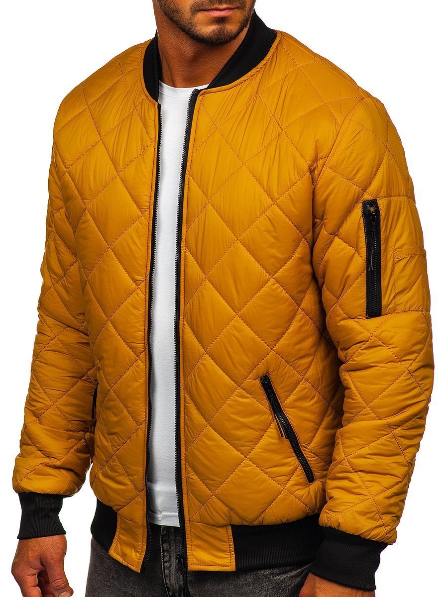 Η καπιτονέ ανδρική μεταβατική μπουφάν τύπου bomber Bolf MY-01A σε καμηλό χρώμα είναι μια μοντέρνα κλασική επιλογή ανάμεσα στα bomber μπουφάν. Το μπουφάν, χάρη στην απλότητα και την ποιότητα κατασκευής του, είναι διαχρονικό και μπορεί να φορεθεί για πολλές εποχές. Το μπουφάν bomber ταιριάζει τέλεια στις τελευταίες τάσεις και είναι κατασκευασμένο από ευχάριστο στην αφή ύφασμα. Είναι καπιτονέ με ρόμβους. Έχει μικρό όρθιο γιακά και κλείνει με φερμουάρ. Τα μανίκια, ο γιακάς και το κάτω μέρος του μπουφάν τελειώνουν με φαρδιά μαύρα λάστιχα. Το μπουφάν bomber έχει δύο πρακτικές εξωτερικές τσέπες με φερμουάρ. Διαθέτει επίσης μία επιπλέον τσέπη με φερμουάρ στο αριστερό μανίκι.