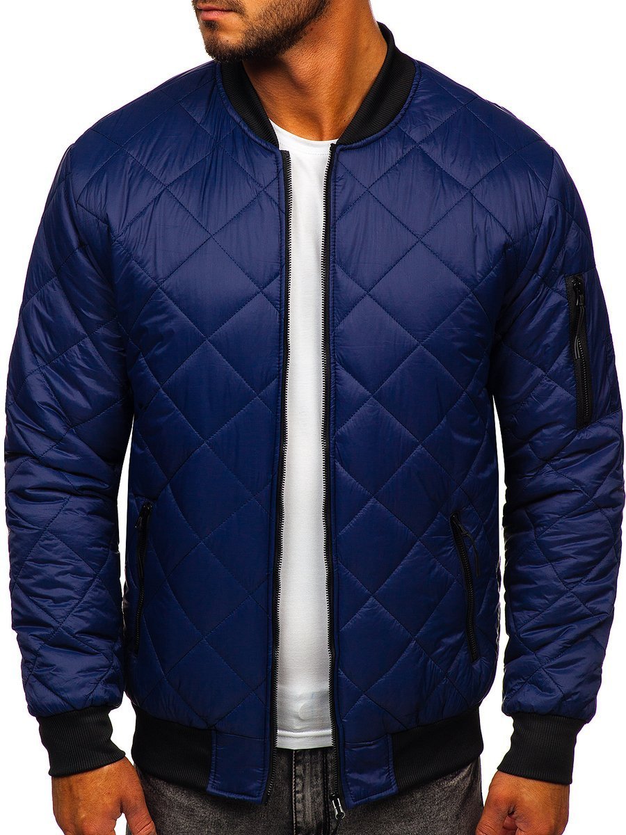 Η καπιτονέ ανδρική μεταβατική μπουφάν τύπου bomber Bolf MY-01A σε σκούρο μπλε χρώμα είναι μια μοντέρνα κλασική επιλογή ανάμεσα στα bomber μπουφάν. Το μπουφάν, χάρη στην απλότητα και την ποιότητα κατασκευής του, είναι διαχρονικό και μπορεί να φορεθεί για πολλές εποχές. Το μπουφάν bomber ταιριάζει τέλεια στις τελευταίες τάσεις και είναι κατασκευασμένο από ευχάριστο στην αφή ύφασμα. Είναι καπιτονέ με ρόμβους. Έχει μικρό όρθιο γιακά και κλείνει με φερμουάρ. Τα μανίκια, ο γιακάς και το κάτω μέρος του μπουφάν τελειώνουν με φαρδιά μαύρα λάστιχα. Το μπουφάν bomber έχει δύο πρακτικές εξωτερικές τσέπες με φερμουάρ. Διαθέτει επίσης μία επιπλέον τσέπη με φερμουάρ στο αριστερό μανίκι.
