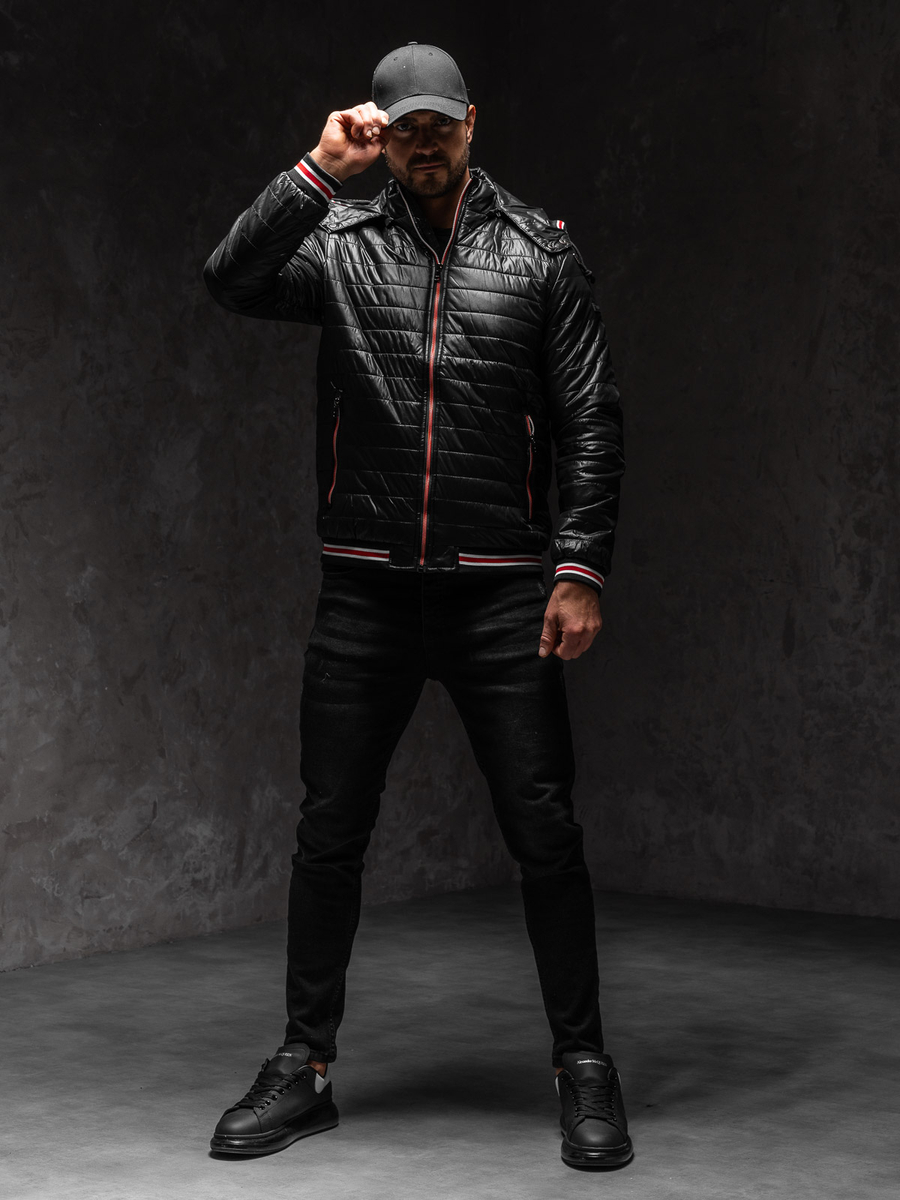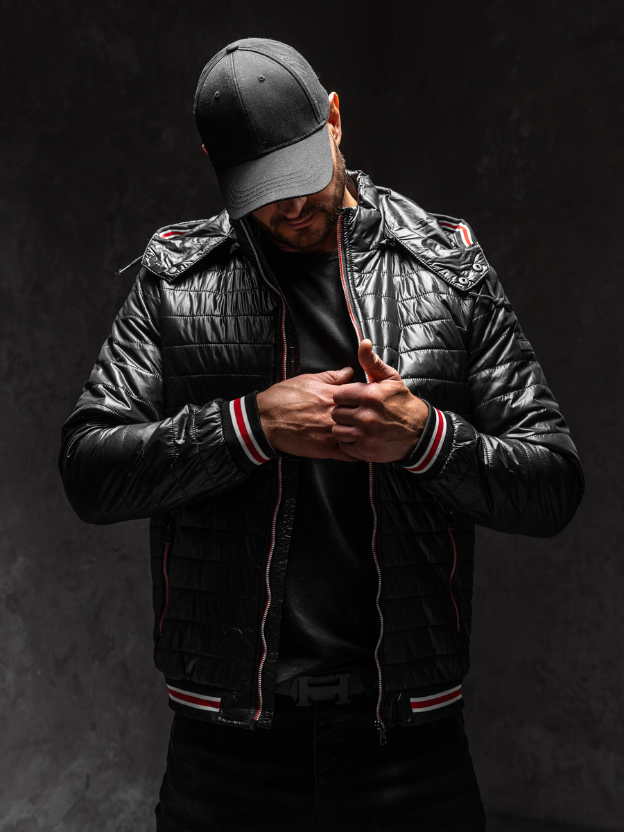 Μαύρο μεταβατικό μπουφάν ανδρικό καπιτονέ Bolf 6191 διαθέτει εντυπωσιακά διακοσμητικά στα λάστιχα και την κουκούλα, καθιστώντας το ξεχωριστό και αξιοσημείωτο. Το μπουφάν έχει μοδάτα οριζόντια καπιτονέ παντού. Κλείνει με φερμουάρ και έχει όρθιο γιακά. Τα μανίκια, η κουκούλα και το κάτω μέρος του μπουφάν τελειώνουν με φαρδιά μαύρα λάστιχα διακοσμημένα με κόκκινες και λευκές ρίγες, που προσθέτουν ένα σπορ χαρακτήρα στο μπουφάν. Το προϊόν διαθέτει δύο πρακτικές εξωτερικές τσέπες με φερμουάρ. Η κουκούλα είναι αποσπώμενη και ρυθμιζόμενη με κορδόνι.